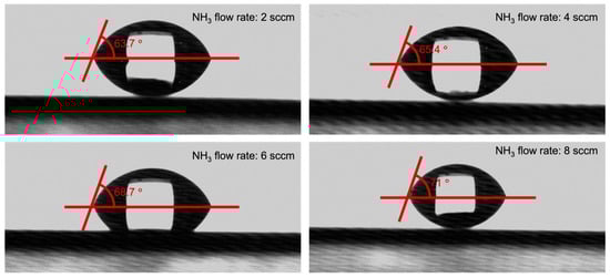 Contact angles of SiCN films deposited with various NH3 flow rates.
