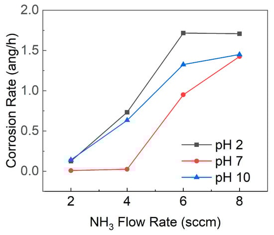 The corrosion rate of SiCN, as depicted in Figure 8, was found to be influenced by the pH of the surrounding environment. For all SiCN films deposited at varying NH3 flow rates, the corrosion rate was highest at pH 2, followed by pH 10, while the corrosion rate at pH 7 was lower than at either pH 2 or pH 10. Furthermore, it was observed that a higher NH3 flow rate during SiCN film deposition led to increased nitrogen content in the film, resulting in a greater corrosion rate. A higher proportion of Si-N bonds relative to Si-C bonds, which may be more susceptible to hydrolysis and attack by H+ or OH− ions, could explain this increased corrosion rate.