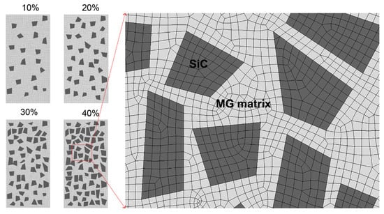 Figure 1. FEM models of Ti-based MGMC reinforced with different volume fractions of SiC particles, with an enlarged image showing the details of mesh division.