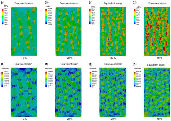 Figure 2. Contour maps of equivalent stress analysis at 5% deformation for MGMC samples with different SiC volume fractions of (a) 10%, (b) 20%, (c) 30%, and (d) 40%, and the corresponding equivalent plastic strain analysis of samples with different SiC content of (e), 10%; (f), 20%; (g), 30; and (h), 40%.