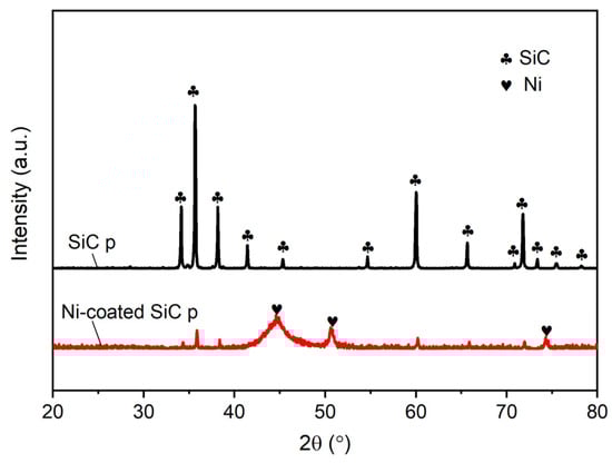 Figure 3 shows the XRD patterns of the original SiC particles and the SiC particles after electroless Ni plating. The sharp diffraction peaks in the XRD pattern of the as-received SiC particles correspond to SiC crystals, indicating that the tested original powder sample contains a single SiC phase and its purity is high. For the XRD pattern of the Ni-coated SiC particles, in addition to the weak peaks of crystalline SiC, there is also a group of diffraction peaks that have undergone significant broadening, with peak angles consistent with those of Ni crystals. We know that the products of alkaline electroless nickel plating are P-rich, Ni-based amorphous alloy or nanocrystalline alloy, which may be the main reason for the broadening of the Ni peaks. It should be noted that the height of the Ni peak is significantly higher than the main peak of SiC, indicating that the surface of SiC particles has been successfully coated with Ni after plating. The existence of weak peaks in SiC can be attributed to the fact that the electroless Ni coating is very thin, thus, the conductive X-ray can penetrate the coating. In addition, some SiC particles were missed during electroless plating, resulting in their failure to form a surface coating and exposing a certain amount of surface to be detected.
