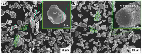 Figure 4 compares the microstructures of the SiC particles before and after electroless nickel plating. Figure 4a shows the microstructure of commercial SiC, indicating that the size of these particles ranges from ~10 μm–~40 μm. Most particles were in the form of single particles, with sharp edges and smooth surfaces, as shown in the inset in Figure 4a, which is not conducive to wettability between the Ti-based MG alloy melt and the SiC particles. Meanwhile, some particles showed a status of loose clusters with rough surfaces—in our opinion, such particles may result in the formation of cast defects which would induce a low strength and Young’s modulus of MGMCs due to the surface status. Therefore, it is necessary to carry out electroless nickel plating to modify the surface structure of SiC particles. Figure 4b shows the microstructure of SiC particles after electroless nickel plating. It can be seen that, after electroless nickel plating, the surface of the SiC particles is covered with a nickel coating as shown in the inset of Figure 4b. It is worth noting that, as the size of the SiC particle increases, the coverage of the Ni coating plated on the particle surface becomes better, while small particles are prone to be partially missing plating.