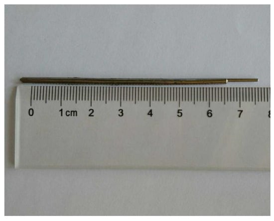 Figure 5 shows an optical photo of the MGMC rod prepared by an injection casting system. The diameter of the cast sample is 2 mm and the length is 70 mm, which is consistent with the size of the inner cavity of the copper mold used, indicating that the composite material melt could completely fill the mold. We know that solid–liquid mixtures containing a large number of solid particles typically have poor flowability, which is not conducive to the formation of castings. In this work, a mixture of (Ti41Zr25Be28Fe6)98Cu2 melt and SiC particles was injected into a copper mold using high-pressure Ar gas up to 2 MPa, which relatively weakened the flowability requirements for the mixed liquid. Under high-pressure injection casting conditions, the forming process is mainly influenced by the heating temperature (which affects viscosity and fluidity) and the content of solid SiC particles. Figure 5 shows that, when the addition amount of SiC is ~30%, its flowability meets the requirements of spray casting molding. We also attempted to achieve a 50% addition of SiC, but it is impossible to obtain cast rods for mechanical performance testing due to the poor formability. Therefore, it is not advisable to add higher volume fractions of solid particles (i.e., over 50%) for injection casting. This is consistent with the limit value calculated by the granular soil model (47%) [65], indicating that the permeation behavior of metal melt between solid particles is similar to that of water in soil.