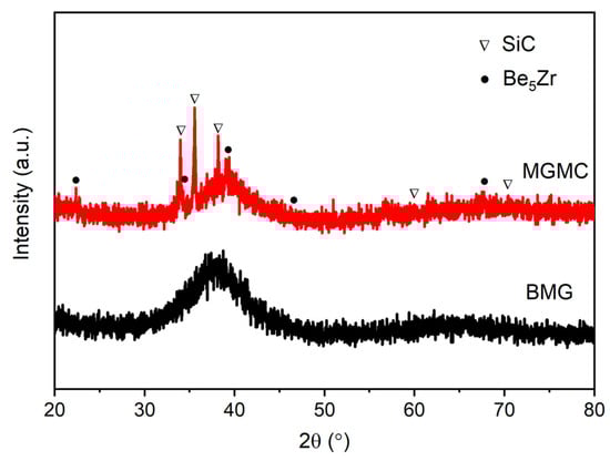 Figure 6. XRD patterns of SiC/(Ti41Zr25Be28Fe6)98Cu2 MGMC and (Ti41Zr25Be28Fe6)98Cu2 BMG sample.