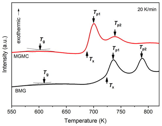 To further confirm the presence of amorphous phases, the DSC curves of the MGMC sample and the BMG sample were tested, as shown in Figure 7. For BMG, a glass transition occurs when it is heated to approximately 609 K, and crystallization begins at 724 K, forming a clear exothermic peak with the peak temperature Tp1 being 735.7 K. The first crystallization is followed by a second crystallization, forming a second exothermic crystallization peak, with a peak temperature Tp2 of 788.9 K. This is a typical behavior of amorphous alloys during heating, which is consistent with the results in the literature [55]. For the MGMC sample, the DSC curve exhibited similar heat absorption and release behavior to the BMG sample, but the glass transition temperature Tg, the onset crystallization temperature Tx, the first crystallization peak temperature Tp1, and the second crystallization peak temperature Tp2 were all lower than that of the BMG sample (as shown in Table 2). It was demonstrated that the MGMC samples contain amorphous phases, but their thermal stability was reduced compared to the BMG samples. In addition, the difference between Tg and Tx is referred to as the width of the supercooled liquid phase zone ΔT (TgTx), which can also be regarded as an indicator of the thermal stability of the sample. The ΔT value of the MGMC sample was decreased by up to 30 K compared to the BMG sample, which also proves that its thermal stability was deteriorated. This can be attributed to the presence of SiC particles in the MGMC sample, which leads to the preferential nucleation of crystalline precipitates on the SiC surface, requiring lower energy and resulting in the formation of a lower Tx.
