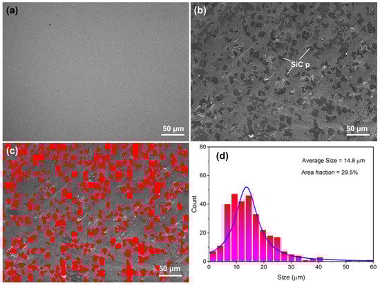 Figure 8. Typical SEM images of (a) (Ti41Zr25Be28Fe6)98Cu2 BMG and (b) SiC/(Ti41Zr25Be28Fe6)98Cu2 MGMC, (c) partial rendering image of (b), and (d) histogram of particle size distribution and area fraction measurement results.