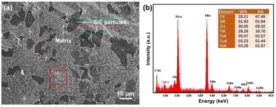 Figure 9. (a) High magnification SEM image of SiC/(Ti41Zr25Be28Fe6)98Cu2 MGMC and (b) EDS analysis results of the matrix area marked by the red box in (a).
