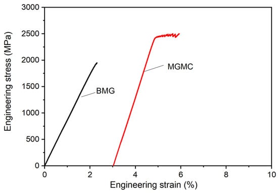 Figure 10. Compression engineering stress–strain curves of BMG and MGMC.