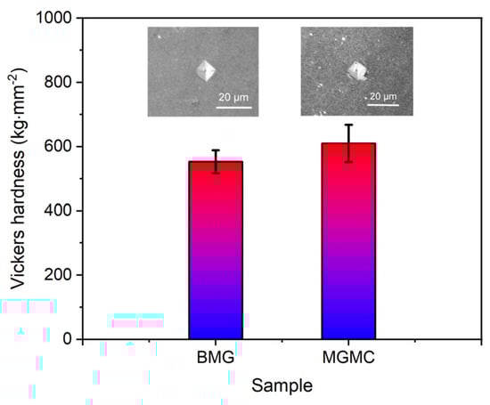 Figure 11. Vickers hardness analysis of the BMG and MGMC sample with typical optical photos of indentations.
