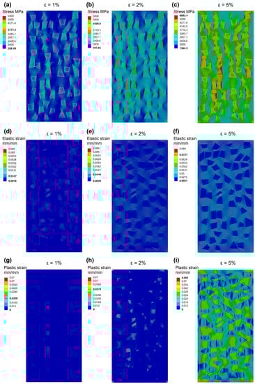 Figure 12. The Contour maps of equivalent stress (ac), equivalent elastic strain (df), and equivalent plastic strain (gi) calculated by FEM based on the 30%-SiC-MGMC samples under different strains of 1%, 2%, and 5%, respectively.