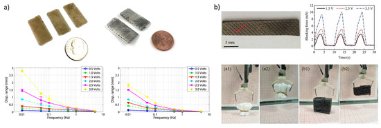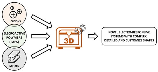 The growing success of AM technologies can be ascribed to increasingly precise and fast printing techniques, but also to the development of printable materials and composites which confer the desired properties to objects. The materials that can presently be manufactured utilizing 3D printing technology include traditional thermoplastics, metals, graphene-based materials, electroactive polymers and ceramics. Electroactive polymers (EAPs) are a class of materials that have gained significant attention in the field of electronics and robotics due to their unique properties. These polymers possess the ability to change their shape, size, and mechanical properties in response to electrical stimuli, making them ideal for actuation and sensing purposes. EAPs are made up of long-chain polymers that exhibit electroactive behavior as result of the presence of mobile ions or polarizable groups within the polymer structure which, under an external electric field, undergo reorientation leading to a change in the shape or globular size of the polymer. This responsiveness to electrical stimuli allows EAPs to function as soft actuators [8,9], artificial muscles and skins [10,11], electromechanical sensors [12], robotic components [13], and micro-valves/pumps [14].
