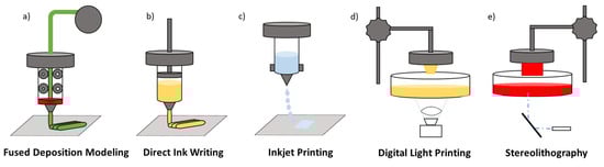 3D printing techniques for polymers can be broadly grouped into two macro-categories: (1) material extrusion-based technologies that include fused deposition modeling (FDM), direct ink writing (DIW), inkjet printing (IP) and similar methods, which build up the object by heating and extruding a polymer filament or ink (Figure 2a); and (2) photopolymerization-based technologies such as SLA and DLP, as shown in Figure 2b, which build up the object by the curing of a liquid-photoactive resin using light sources (laser, LED or a projector) [23]. Each of these two categories has its own set of advantages and disadvantages, and the choice of which one to use will depend on the specific requirements of the project [24].