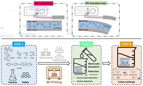 Nafion® [56], eventually combined with other polymers [59], is the most widely used polymer for membrane fabrication due to its commercial availability, chemical stability and the ability of the sulfonate groups to exchange protons with metallic counterions [60]. Other polymers such as polyvinylidene fluoride (PVDF) [61,62], polyvinyl alcohol (PVA), sulfonated polyphenylene sulfone (sPPSU) [63,64], and polyacrylic acid (PAA) have been reported [65]. Once the appropriate polymer for the IPMC membrane is chosen, it undergoes processing to attain the desired thickness and shape. Two primary methods are employed: (1) solution casting and (2) hot pressing. The solution casting technique involves pouring a polymer solution into a mold with the desired shape, allowing it to dry, and repeating the process until the desired thickness is achieved. In the hot-pressing process, films are stacked and subjected to high temperature and pressure, resulting in a single layer of the desired thickness. These methods have been joined in recent years by a third method of preparation, 3D printing, the topic of this review. Some advantages/disadvantages of the three preparation methods are summarized in Table 1.