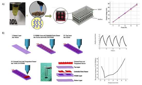 The use of DIW to create IPMCs is still in its infancy. This technique might have a higher applicability than FDM because of the room temperature printing processability that opens up possibilities to print different feedstock polymers, and because it is possible to avoid the extra step of Nafion oxidation. Y. Wang and co-workers focused their research on 3D printing with Nafion-CNT membrane using this technique. In 2018, they published their first work using Nafion and single-walled carbon nanotubes (SWCNT) as the base components of the 3D printed membrane. They prepared a Nafion-based ink by mixing a commercial Nafion dispersion (DE520) with N,N-dimethylacetamide (DMAC) in a 1:4 v/v ratio and concentrating it to the right viscosity. The mixture was printed, giving a sandwich structure with five layers of SWCNTs (with a thickness of 100 μm) per side and, in the middle, 10 layers of Nafion (with a thickness of 200 μm). It was tested as a pressure sensor and showed a sensitivity about 5.95 mV·N−1 over eight acquisitions; the sensor response was linear with high accuracy in the measured range [88].