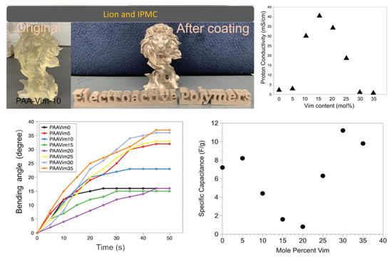 Wang and co-workers focused their attention on a poly(acrylic acid-vinylimidazole) (PAAVim)-based membrane, a new example in the field of IPMCs, and tried to take advantage of the high ion exchange capacity [96] and easy synthesis of PAA. They printed different membranes, with increasing molar fractions of Vim, from 0 to 35 percent.