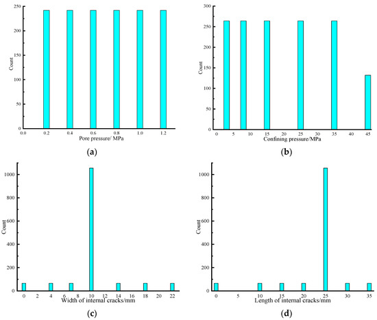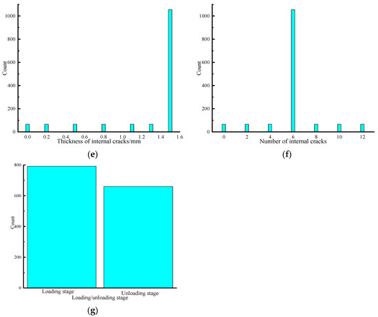 Data distributions of the built database. (a) Pore pressure; (b) Confining pressure; (c) Width of internal cracks; (d) Length of internal cracks; (e) Thickness of internal cracks; (f) Number of internal cracks; (g) Loading or unloading state.