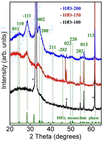In order to gain further information about the film microstructure, a second optical model was used for the SE fitting by using the reported optical properties of m-HfO2 from the database of the WinElli II software. In this case, the model considered the main film as an EMA with a mixture of voids and m-HfO2. This model provided a similar fitting goodness as compared to that obtained with the Cauchy dispersion law. However, in this case, we were able to make an estimate of the porosity from the calculated concentration of voids in the samples. The values obtained were 21, 15 and 12% for HfO-100, HfO-150 and HfO-200, respectively. These values correlate with the oxygen excess extracted from EDX. In addition, the density of the HfO-200 sample determined by the combination of RBS data and film thickness provides a value around 9.18 g/cm3. From this value, we can estimate a 5.16% porosity by comparison with the bulk density value of HfO2 reported in the literature [42]. Therefore, the high content of oxygen can be related to the porous condition of the films, as can be seen in Figure 5 and Table 4.