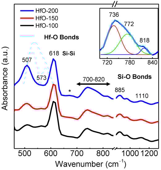 Figure 2 shows the FTIR spectra of the deposited films. The observed bands can be ascribed to some of the reported typical IR vibrational modes known for amorphous (a-HfO2) and m-HfO2 phases [16,23,24]. The bands related to the presence of Hf-O bonds were reported at different zones for the middle IR region within 400–800 cm−1 [16,23] associated with the vibrational modes (named Au and Bu) for m-HfO2. To study the bands in the IR spectra in detail, we considered three zones where absorption peaks were detected as discussed below. First, we performed the deconvolution of the broad band in the region of 462–640 cm−1, where three peaks around 507, 573 and 618 cm−1 were obtained. A feature around 507 cm−1 is clearly observed in Figure 2 and can be attributed to Au and Bu vibrational modes in m-HfO2. These modes are related to atomic displacements parallel to the c-axis of the unit-cell and the atomic displacement parallel to the x-axis of the unit-cell, respectively [24]. The signal from 570 cm−1 can be attributed to amorphous Hf-O bonds [16]. Note that the amorphous character of these films was confirmed by the XRD measurements. The signal around 618 cm−1 can be considered a Si-Si vibration [25] coming from the substrate. The second zone considered was related to a very weak signal in the 641–671 cm−1 range (marked with *), and it was also related to the overlapped signal of Au and Bu modes of the m-HfO2 structure. In this case, they account for the displacement already considered from the c- and x-axis at 641 and 651 cm−1 values, respectively [24]. However, in all the spectra, the signal was very weak, and only qualitative trends could be extracted. Finally, deconvolution in the 700 to 820 cm−1 range showed three bands (see inset in Figure 2): two of them, at 736 and 772 cm−1, were associated with a phonon mode of m-HfO2 [23] and another band, at 818 cm−1, was related to the Si-O bond. The band at 736 cm−1 is considered a Bu vibrational mode [24], while the band at 772 cm−1 in this work coincides with the reported value and remains almost constant in all the IR spectra [23]. The deconvoluted peak can be itself divided into two components, a signal coming from the interfacial SiO2 for symmetrical stretching and another from the Bu vibrational mode parallel to the x-axis, which is relatively more intense in the aforementioned report [24].