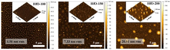The influence of WHf on the film surface morphology is illustrated using AFM (Figure 3). The surface roughness increased from around 5 to 21 nm for the HfO-100 and HfO-200 films, respectively. At low WHf, the surface topography is rather homogeneous, and the obtained roughness is assumed to be a characteristic feature of the whole sampled surface. At high WHf, the situation is complex, since the contribution to the roughness comes from two different features: first, relatively high hill-like structures (mounds) and a smoother granular structure in the global plane. The grain morphology is also present on the surface of the hill-like structures, indicating the same nature and structure of the material giving origin to both morphological features. These phenomena were observed previously in the case of crystal growing by ALD [22], but in that case, the structure was related to higher temperatures that favor smoother surfaces with a higher crystalline structure. Nevertheless, in both cases, there was a smaller and relatively general granular structure convoluted with the formation of large mounds [29].