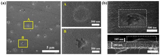 (a) Top-view SEM images of HfO-200 film: (A,B) regions are the zoom-in images of the yellow squares (2.5 µm × 1.75 µm), respectively. (b) Tilted-view and cross-section SEM images of HfO-200 thin film a with visible collapsed mound and porous structure.