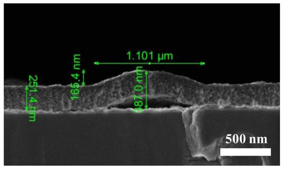 The formation of protruding structures at WHf = 200 W and the formation of empty voids underneath (as evidenced by SEM) resemble the blistering effect observed in thin films. It should be noted that this phenomenon was already observed in HfO2 grown by the sol–gel technique but was less noticeable than in this work [32]. In addition, the diameter of the observed structures was much larger than the film thickness, a condition required for blistering [33]. The presence of blistering was clearly confirmed in the SEM images shown in Figure 6. Note that the dimensions of the mounds (height and diameter) are in agreement with the values obtained by the AFM analysis reported in Table 3.