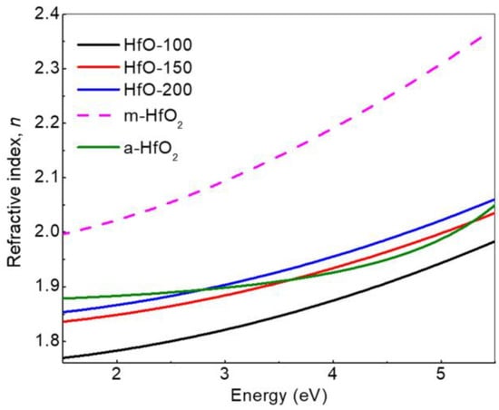 From ellipsometric parameters Ψ and Δ, obtained by SE, simulations were carried out that allowed us to obtain the value of the thickness and the refractive index for the films grown at different deposition powers. To carry out the calculations, a basic structure formed by the crystalline silicon substrate with a native SiO2 on top and a dispersion model for the main HfO2 film (Si-cr/SiO2/HfO2) were used. In addition, an outer layer with an effective medium approximation (EMA) of film and voids (air) was included to account for film roughness. The optical constants of the Si substrate and SiO2 were provided by the WinElli II software. In the case of the HfO2 layer, the Cauchy dispersion model for transparent film was used to fit the optical response. The goodness of the fitting was assessed by the coefficient of determination (R2) values of the regression analysis, which were always above 0.9. The thickness values calculated by SE are comparable to those obtained by profilometry (79, 138 and 297 nm for HfO-100, HfO-150 and HfO-200, respectively). The typical expressions of the fitting model for the refractive index and the extinction coefficient of the HfO2 layer read as follows: n = A + B/λ2 + Cλ4, and k = 0 for the spectral region considered (240–890 nm). From the simulation, the refractive indices obtained for the films in the measured spectral region are shown in Figure 7. The values for A and B are shown in Table 4. These values are close for the parameter A reported for m-HfO2 [39,40] and a-HfO2 [3], which are 1.9627 and 1.85 in the transparent region (where the value of the absorption coefficient is taken as 0), respectively. In the model, the constant C was considered 0. As can be seen in Figure 7, the refractive index of these films is greater than or equivalent to that obtained for a-HfO2 in other reported works [3]. For low energies, the refractive index values were in the range of 1.77–1.85, and in the range of 1.98–2.06 for near-UV. These values are very appropriate for thin layer applications in various electronic devices [16] and optical systems [41]. It should be noted that the presence of mounds on the surface does not seem to affect the optical properties. This can be understood from the formation of continuous films with homogeneous thickness together with buckled regions (mounds).