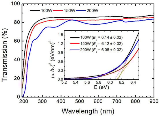 The optical transmission spectroscopy measurements in the UV–Vis–near-IR range are shown in Figure 8. The average optical transmission is over 80% in the whole range between 300 and 900 nm. The variation in the value of the optical gap energy for the studied power deposition is indicated in the inset of the figure. The bandgap was calculated using the Tauc plot considering direct transitions [43]. This assumption was taken into account by the almost amorphous nature of the samples [44]. The optical band gap, Eg, was determined from the expression αhv~(hv-Eg)r, where α is the optical absorption coefficient, h is the Planck’s constant, v is the frequency of radiation, and the exponent r depends on the nature of optical transition. In the present case, the best fit in the Tauc plot was obtained for r= 1/2, which shows that direct transitions in these films are allowed. The calculations showed that the energy of the optical gap decreased as the deposition power used in the growth process increased, leading to high values in all cases, considering that the value usually reported for m-HfO2 is 5.8 eV [45].