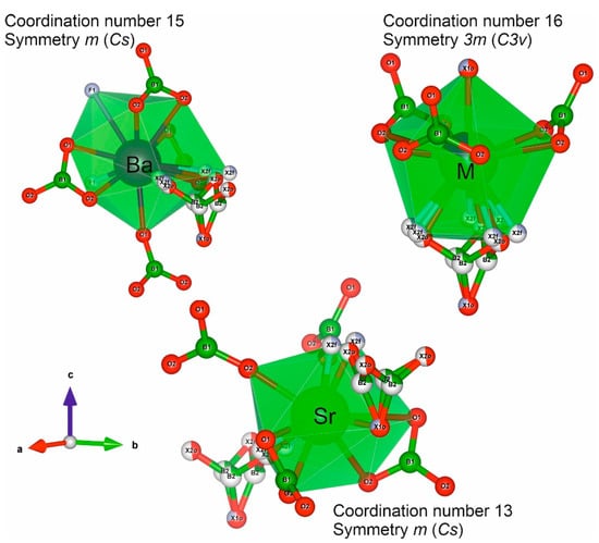 Coordinated environment of three different cationic positions, Ba, Sr, and M, in the Ba4−xSr3+x(BO3)4−yF2+3y (P63mc) solid solution. Position M is statistically populated with Ba and Sr.