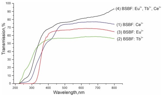 Transmission spectra of 1 mm thick plates made of doped Ba4−xSr3+x(BO3)4−yF2+3y (BSBF) crystals: (1) BSBF: Ce3+, (2) BSBF: Tb3+, (3) BSBF: Eu3+, (4) BSBF: Eu3+, Tb3+, Ce3+. Photographs of the corresponding plates are given in Table 1.