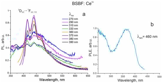 BSBF: Ce3+. The 5d1→4f1 luminescence of Ce ions sufficiently depends on the nature of the matrix and is in the range from the ultraviolet to the red region of the visible spectrum [19,20,21,22]. In the photoluminescence (PL) spectra of BSBF: Ce3+, weak nicely resolved bands corresponding to the Ce3+ 5D3/2→2F7/2, 2F5/2 transitions are detected at 400–500 nm under 360–390 nm excitation at 77 K (Figure 3a). Transitions in the same spectral range assigned to cerium ions were reported for Ba2Y5B5O17: Ce3+ phosphor [21]. It is also possible to distinguish an additional band with a maximum of around 460 nm, most clearly at 360–390 nm excitation. For emission at 460 nm, the maximum of the excitation band is about 360 nm (Figure 3b). A similar broadband at 400–500 nm associated with intrinsic defects is observed in the luminescence spectra of undoped crystals at 365 nm excitation [13].