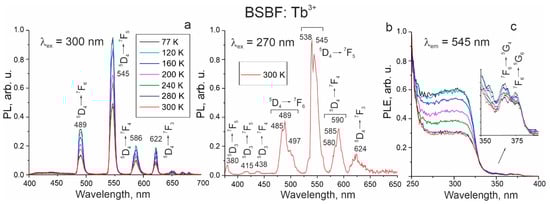 PL spectra of BSBF: Tb3+ crystal at 300 nm (a) and 270 nm (b) excitation and PLE spectra for emission at 545 nm (c). Spectra coloring for (c) is the same as it is in (a).