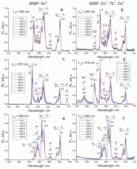 Transitions with J > 0 depend on the site symmetry [33]. According to Ref. [34], the number of components for 5D0→7Fj (J = 0–4) transitions is 1, 3, 5, 7, and 9 for the site with Cs symmetry, and 1, 2, 3, 3, and 5 for the C3v site. It is worth noting that the major difficulty in unambiguous assignment of the peaks is their overlap due to a small crystal field splitting. The symmetry-sensitive 5D0→7F1 of magnetic-dipole nature and 5D0→7F2 of electric-dipole nature transitions are usually taken into consideration to establish a connection between site symmetry and band splitting [24,35]. In both BSBF: Eu3+ and BSBF: Eu3+, Tb3+, Ce3+, the splitting of the bands related to these transitions is observed (Figure 5). Thus, the BSBF: Eu3+ crystal at 300 nm excitation exhibits three well-resolved peaks at about 586, 592, and 603 nm associated with the 5D0→7F1 transition (Figure 5a). The intensity of various transitions in the spectra of BSBF: Eu3+ nonmonotonically changes with temperature (Figure 5a,c,e).