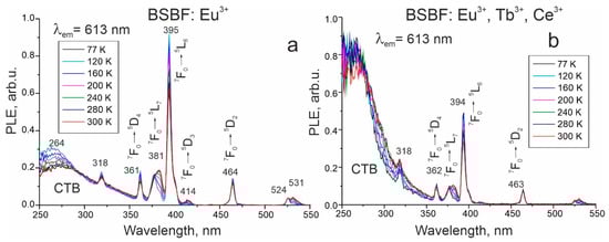 PLE spectra of BSBF: Eu3+ (a) and BSBF: Eu3+, Tb3+, Ce3+ (b) for emission 613 nm, CTB—charge transfer band.