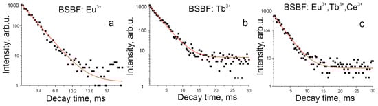 In order to verify the realization of energy transfer from terbium to europium, reported for a number of compounds such as La3GaGe5O16:Tb3+, Eu3+ [36], La0.02Tb0.90Eu0.08PO4 [37], A3Tb0.90Eu0.10(PO4)3 (A = Sr, Ba) [38], WO3: Tb3+xEu3+y [39], we measured decay times for the BSBF: Eu3+, BSBF: Tb3+, and BSBF: Eu3+, Tb3+, Ce3+ crystals. The decay time for BSBF: Eu3+ for emission at 613 nm after excitation at 395 nm is 2.2 ms (Figure 7a). Decay times for BSBF: Tb3+ (Figure 7b) and BSBF: Eu3+, Tb3+, Ce3+ (Figure 7c) for emission at 545 nm after excitation at 300 nm are typical of terbium ions and close enough in value, 2.58 ms and 2.64 ms, respectively, which cast doubt on the implementation of energy transfer.
