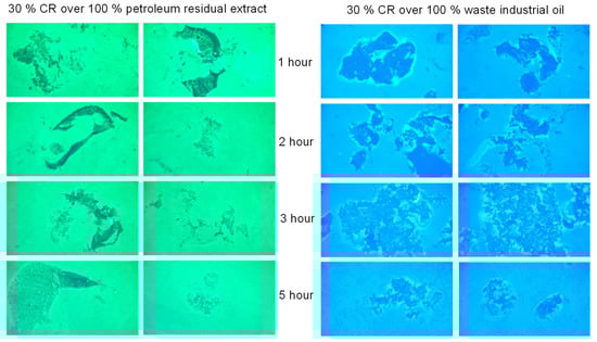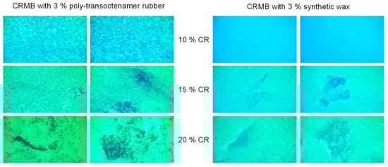 - the uniformity of the crumb rubber distribution in the volume of the CRMB will be assessed by fluorescence microscopy. Fluorescence microscopy is performed using a MIKMED-2 Luminescence Microscope equipped with a high-pressure mercury ultraviolet lamp. This method is a simple analytical technique for evaluating the morphological characteristics of crumb rubber-modified systems. A small amount of heated sample was loaded and thoroughly crushed between two slides. The slide with the sample was then cooled to room temperature and viewed under a microscope with a magnification of 500× in the MIKMED-2 Luminescence Microscope program.