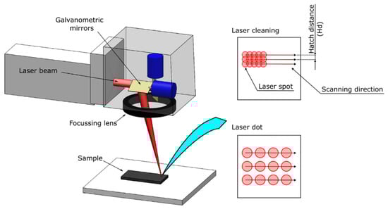 The system was controlled via a software programme that enables the management of the laser power (P), pulse frequency (F), number of repetitions (R), scanning speed (Ss), and scanning strategy. The average power can be changed by varying the power supply provided to the pumping diodes. Figure 1 depicts a schematic of the laser treatment; the scanning direction and the hatch distance (Hd), i.e., the distance between two successive scanning lines, are highlighted. By changing the pulse frequency and the scanning speed, it is possible to change the pulse overlap, i.e., the distance between two consecutive laser footprints. The laser parameters were selected based on previous experience [51,52]. The values for the two laser treatments performed—laser cleaning (LC) and laser dots (LD)— are shown in Table 3. It is worth noting that by adopting a high scanning speed (4300 mm/s), laser footprints were created without overlap.