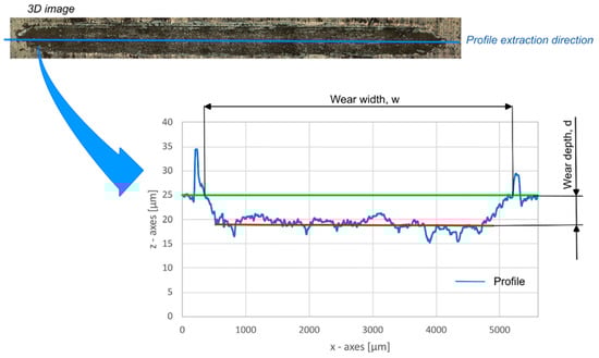 For the samples that did not exhibit coating failure during the test, an additional 500 m test was conducted to evaluate the CBD. The maximum depth, d [µm], and the maximum wear width, w [µm], were measured via the use of a 3D digital video microscopy system (KH-8700 by Hirox, Hackensack, NJ, USA) using the MXG-2500 REZ “revolver” optics with 350× magnification and adopting the “3D tiling” function. This function allows for the system to move along 3 axes, acquiring the surface. Then, after the surface is rebuilt, the function is able to measure the profiles extracted by the 3D surface. Figure 2 depicts a schematic of wear track measurement; wear depth and the width of the tracks were calculated by extracting the profile in the middle of the tracks.