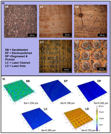 It can be seen from Table 6 that the SB treatment appeared to be the roughest, which is in agreement with the images in Figure 3, with a Ra value approximately an order of magnitude higher than the other pretreatments. In contrast, the EP sample turned out to be the least rough. The laser treatments showed higher values than the DP treatment but with Ra still inferior to 1 µm.