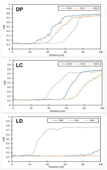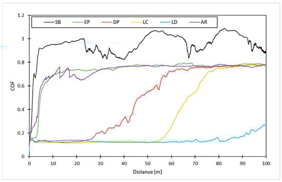 Surface pretreatment analysis was performed preliminarily by evaluating the friction coefficient of the various treated surfaces coated with electrophoretic deposition at the same conditions; the friction curves are shown in Figure 4.