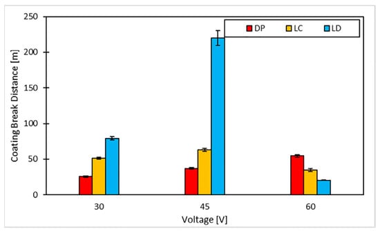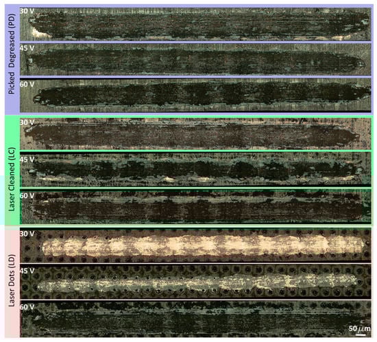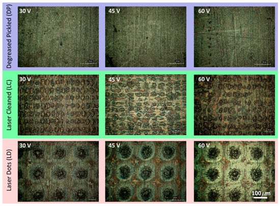 Figure 5 depicts the optical images of the coatings obtained at different voltages for the three selected pretreatments. The graphene is preferentially disposed of within the dots created. In particular, in the LD surface, the graphene is arranged in the dimples’ centre; in the LC, the arrangement of graphene is inhomogeneous and follows the surface irregularities that characterise this treatment. This suggests that surface dimples promote graphene deposition. The DP treatment did not produce depressions, thereby achieving a more homogeneous deposition.