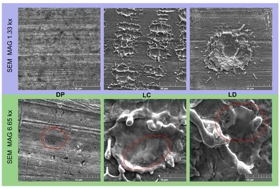 The SEM images shown in Figure 6 reveal the presence of graphene. The laser-treated samples concentrate the graphene particles within the surface irregularities created by the treatment. In contrast, the DP samples present homogeneously distributed graphene on the surface, leading to continuous film deposition.