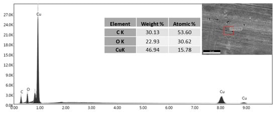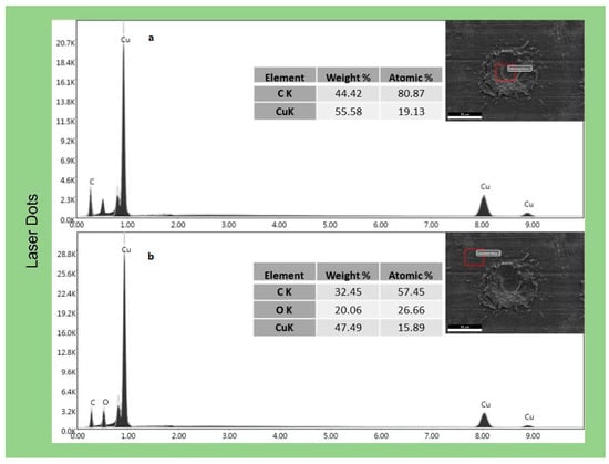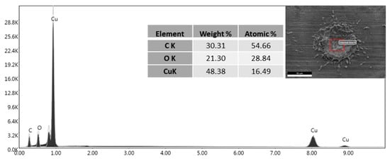 EDX analysis (Figure 7) confirmed this behaviour, as the carbon presence on the flat surface produced by pickling and degreasing is notable. EDX analysis of laser-treated samples confirmed how graphene concentrates in the depressions created by the laser both in LC (Figure 8) and in LD (Figure 9). EDX performed outside the craters produced by the interaction with the laser revealed the presence of oxygen due to the oxidation of copper caused by the anodic EPD process. On the other hand, within the cavities, the absence of oxygen peaks indicates the presence of graphene-coated depressions, preventing the oxidation process. At a voltage of 60 V, however, the oxygen peak can also be detected inside the cavity in the LD samples (Figure 10). The high voltages and the charge accumulation on the dots’ edges produce a Faraday cage effect that prevents the graphene from depositing inside the reentrant.