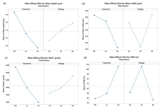 Figure 14 shows the main effect plots for wear depth, width, volume (w × d), and CBD; the not statistically significant plots are in dashed lines.