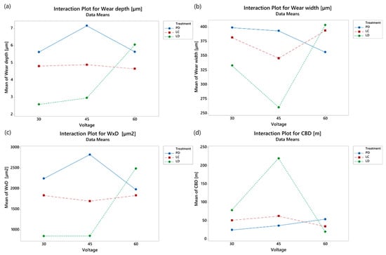 Interaction plots: (a) wear depth, (b) wear width, (c) w × d, and (d) CBD; not statistically significant interactions are masked or not reported.