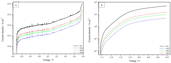 Experimental polarisation curves (black) of the materials constituting the sheet, (a) curve referring to the core material (steel BH210) and (b) curve referring to the coating material (zinc). Possible variations of current at fixed voltage are represented by coloured curves (blue + 10%, green + 20%, red + 30%).
