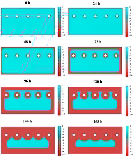 For a visual comparison between simulated and experimental results, corrosion evidence is reported for selected time intervals in Figure 5, starting from the initial situation at 0 h, with a fully cyan-coloured sheet and a fully zinc-coated sheet of steel. After 48 h of exposure to aqueous sodium chloride solution, external edges of the coated sheet start corroding, as it is observed in the simulated sheet by the red-coloured region. Comparing the sheet exposed to the salt fog after 48 h, it is visible that there is a large corrosion along the external edge at the bottom of the sheet and a more uniform corrosion on the other regions. Then, after 120 h, both external edges and regions near the holes appear to be corroded in simulated data, while, even in this case, the experimentally tested sheet shows a more uniform corroded condition. Finally, after 168 h, the result of simulation shows a homogeneous corrosion of the whole surface, except for the internal region, which is in contrast with the experimentally tested sheet, showing a distribution of corroded surfaces. In general, the simulation for high time frames demonstrates an advancement of the corrosion and, consequently, a decrease in the thickness of the protective zinc layer. However, the boundary conditions neglect the triggering of corrosive phenomena in specific points of the lamination.