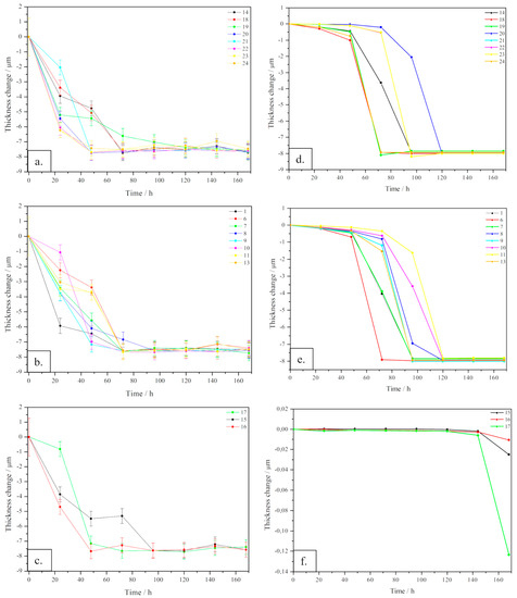 A comparison of both experimental and simulated results is shown in Figure 4a–c, which reports experimental data on points (see Figure 1) near the boundaries, near the holes and inner points, respectively; (d), (e) and (f) report data simulated with COMSOL Multiphysics on the same positions. For experimental data referring to points near edges and near holes (Figure 4a,b), the general trend is rather similar, showing a corrosion process starting with a visible decay in thickness change up to 70 h, then the thinning becomes less prominent, reaching a plateau value near 8 µm, corresponding to the total consumption of the coating thickness (7 µm) and a starting corrosion of the core material. In Figure 4c, referring to internal points, the overall trend is similar to those previously described, but with larger fluctuations in the time interval between 50 and 70 h. Comparing the simulated results with the experimental data, some differences are clearly visible. In Figure 4d,e, the thinning proceeds slowly up to 50 h, then, in the time range between 60 and 120 h, a sudden decrease of the coating is visible, reaching a final plateau corresponding to its total consumption. In Figure 4f, the thickness change is close to zero up to 120 h, then a very slight variation can be observed.