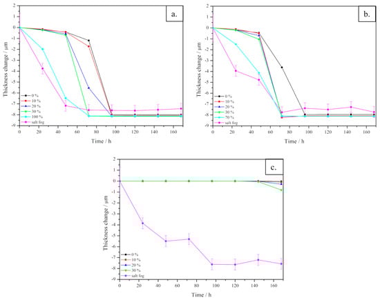 Discrepancies between experimental and calculated data can be primarily attributed to the fact that, in simulating the process, COMSOL assumes ideal surfaces without any defects. This is a crucial aspect, because corrosion mechanisms are usually triggered by imperfections, asperities related to roughness and, more generally, to high energy surfaces, of which simulated sheets are lacking [1]. Another observation, useful to understand the differences between the two sets of results, is that in experimental data, the thickness variation is related to the initial thickness of the zinc coating, which was not the very same for each sample sheet. Therefore, an error is associated with the results, as represented in Figure 4a–c by error bars.