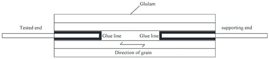 Pull-out tests can be performed to obtain a bond–slip model of steel glued in glulam. Different loading methods are recommended for pull-out tests [12], among which pull–pull loading is often adopted for quantifying the bond strength of ribbed bars or threaded rods parallel to the grain of glulam, as shown in Figure 1. During testing, a tension force was applied at the tested end and the slip of the rebars or rods relative to the timber block was measured. A supporting end was also designed so that the specimen could be fixed to the testing machine.