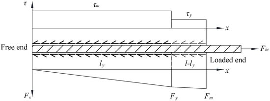where is the post-yield bond stress, is the maximum force of the rebars or rods, is the yield force of the rebars or rods, d is the diameter of the reinforcement, l is the anchorage length of the reinforcement, and the distance from the free end to the section where the reinforcement yields, and can be calculated using Equation (3).